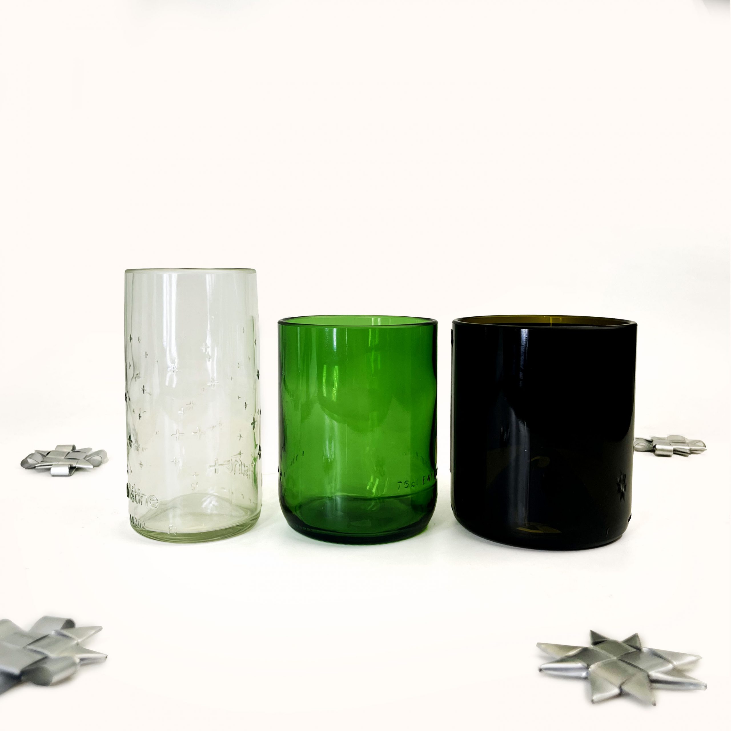 Oleh karena itu kami membuat produk daur ulang sampah botol kaca yang berasal dari rumah tangga, cafe, serta toko minuman anggur. Gelas kaca ini dapat dipakai ulang dan aman untuk minuman bersuhu tinggi maupun rendah.